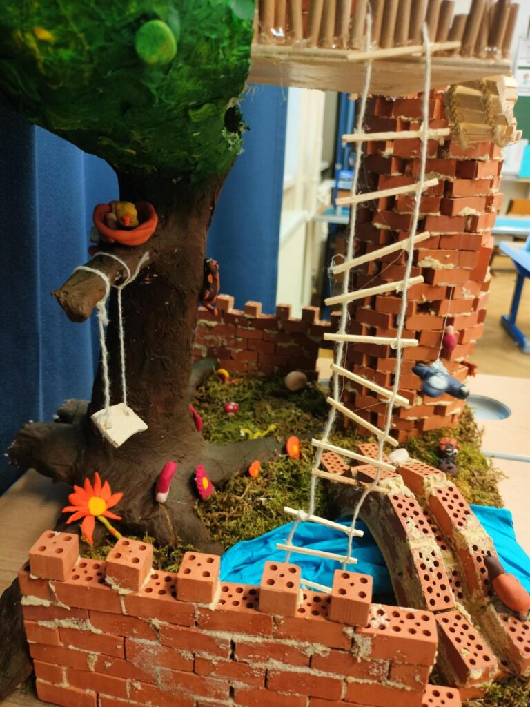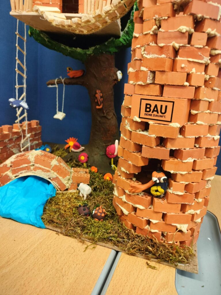 Die Klassen 3a und 3b haben dieses Jahr bei dem Wettbewerb „Bau deine Zukunft“ mitgemacht und gemeinsam eine kleine Welt erträumt, in der Menschen, Tiere und Pflanzen miteinander leben. Für „Unsere traumhafte Waldwipfelwelt“ haben die Kinder gemeinsam in einem Brainstorming Ideen gesammelt, um dann in klassenübergreifenden Kleingruppen daran zu bauen. Trotz einigen Hoppalas und Schwierigkeiten war der Bau ein großer Spaß für die beiden Klassen! Natürlich ist die Hoffnung groß, dass das Projekt auch eine gute Platzierung bei dem Wettbewerb erzielt.